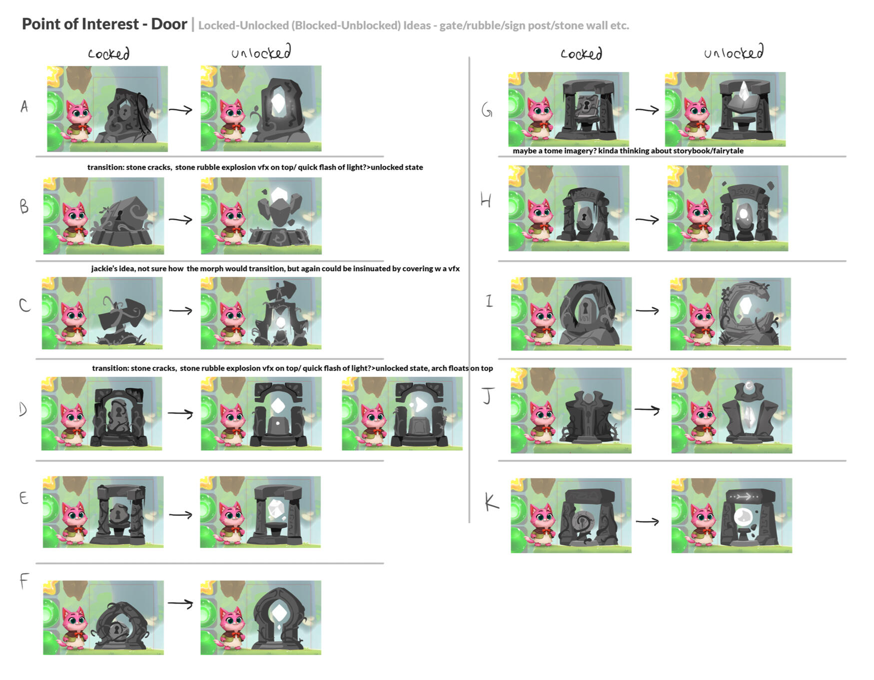 Sketch Concept (Ivan) -> Final 2D Art (Lucy) -> Final Spine Anim (Ivan) -> Screen layout / Motion iteration (Lucy) -> Unity implementation (Ivan / Engineers / Whimsy)